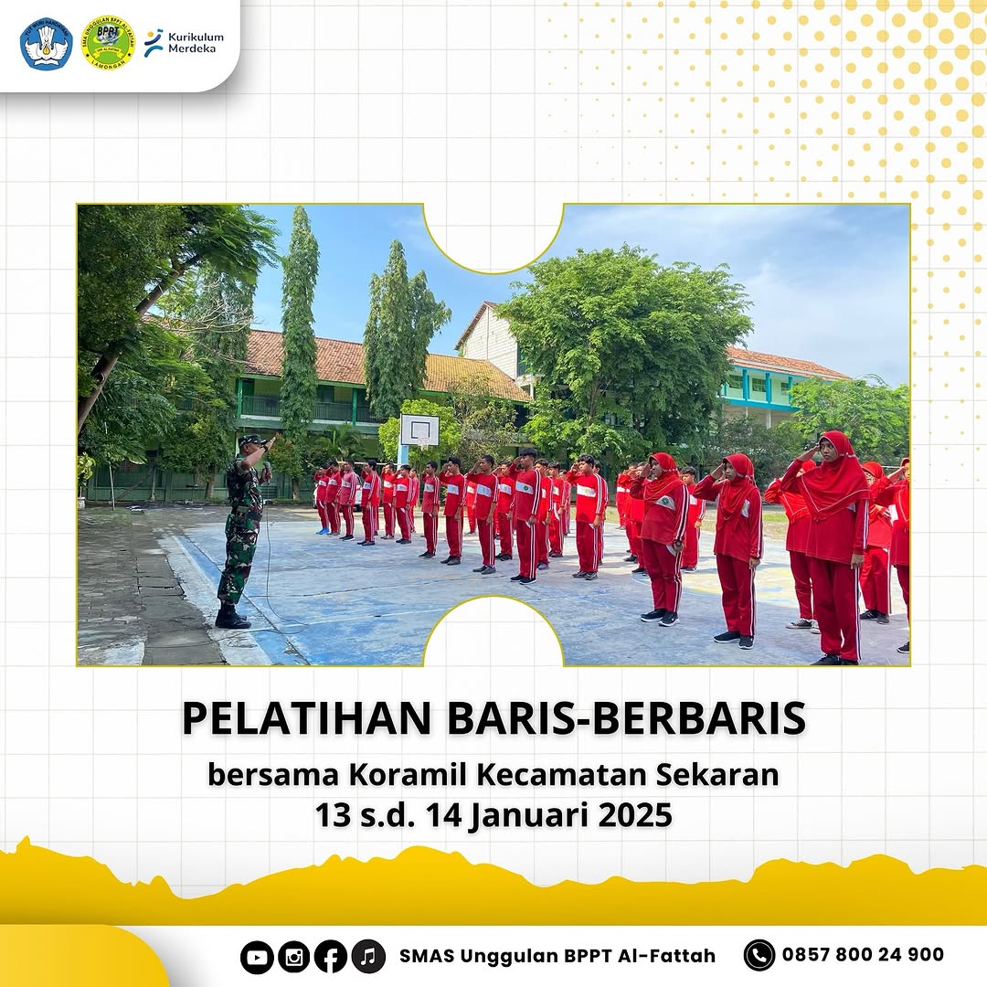 Pelatihan Baris-Berbaris bersama Koramil Kecamatan Sekaran dilaksanakan pada 13 s.d. 14 Januari 2025 di lapangan SMA Unggulan BPPT Al Fattah.