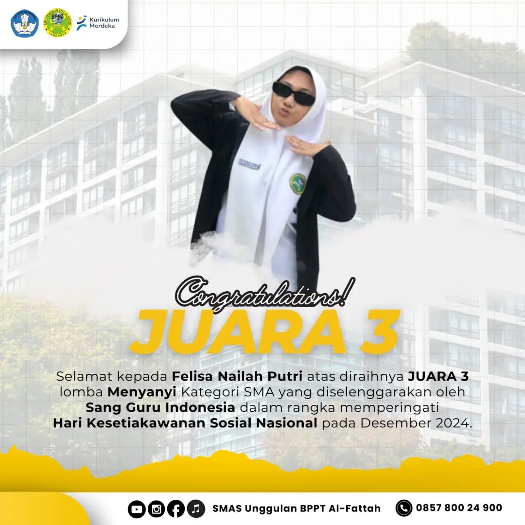 Selamat kepada Felisa Nailah Putri atas diraihnya JUARA 3 lomba Menyanyi Kategori SMA yang diselenggarakan oleh Sang Guru Indonesia dalam