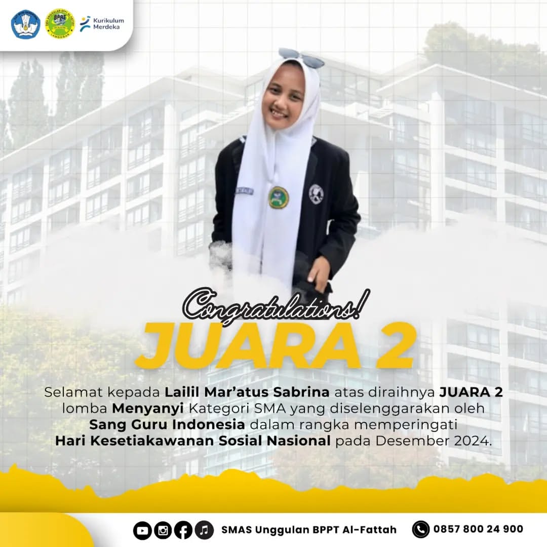 Selamat kepada Lailil Mar’atus Sabrina atas diraihnya JUARA 2 lomba Menyanyi Kategori SMA yang diselenggarakan oleh Sang Guru Indonesia dalam